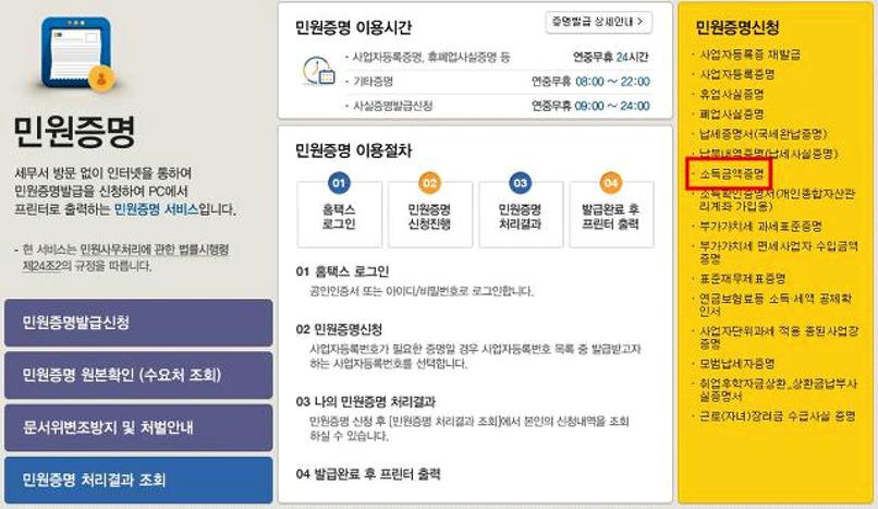 '소득금액증명' 메뉴를 눌러 보신다면 해당 증명서를 인터넷을 통하여서 신청해보실 수가 있는데요. 이 방법은 프린터만 있다보게 되면 바로 출력이 가능하기 때문에 아주 편리하기도 한데요.